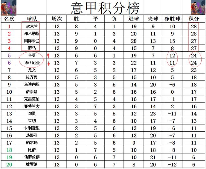 积分榜方面,AC米兰,那不勒斯齐头并进,AC米兰1个净胜球的微弱优势领跑,国米,罗马1分之差紧随其后。博洛尼亚今天若是能赢3个球的话,他们就能超过国米杀入前三,只是他们爆冷输球后,不仅不能追赶前4,还因少了1个净胜球,被黑马科莫躺着超过,跌到第6。